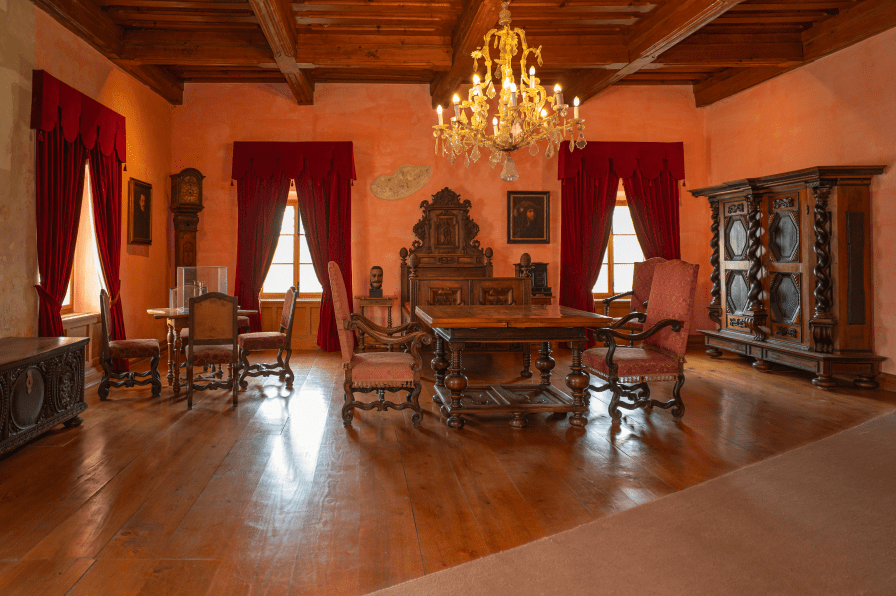 Prostorija je namještena u stilu njemačkog baroka. Kabinetski ormarić, krevet, ormari i škrinje potječu iz 17. stoljeća, a stolice su izrađene po francuskom uzoru. Zanimljivi su stolovi: jedan na rasklapanje, a drugi kartaški. Posebno se ističu bogato oslikano ovalno ogledalo i luster iz 18. stoljeća. Barokna se soba od drugih prostorija na tom katu razlikuje po starim sačuvanim drvenim vratnicama koje se nalaze s vanjske strane ulaza u prostoriju. Vratnice imaju u reljefu izvedene dovratnike i nadvratnu gredu s izrezbarenima velikim slovima i brojkama: 16 PB AS 39. Brojke označavaju 1639. godinu. Slova PB AS su kratice te se vezuju uz funkciju prostorije (presbiterium ara sacra), jer je vjerojatno u 17. stoljeću služila kao dvorska kapela.