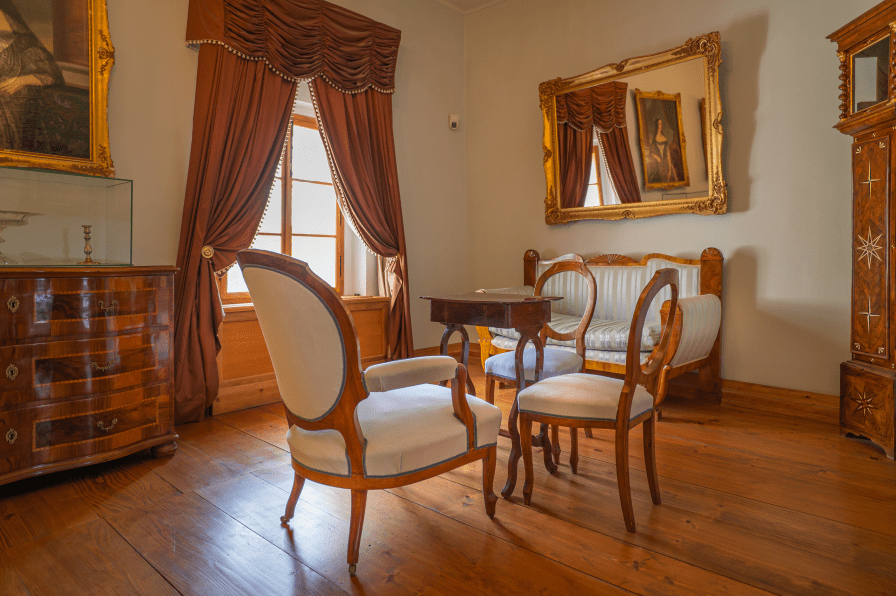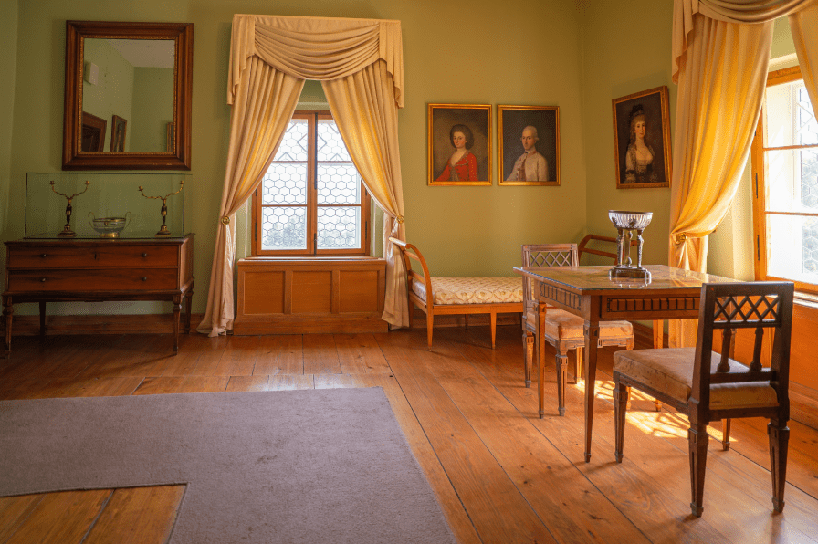 Soba je namještena inventarom sa stilskom karakteristikama klasicizma (prijelaz iz 18. u 19. stoljeće). Sadrži namještaj za dnevni prostor. Prostor je upotpunjen još i dvama svijećnjacima iz napoleonskog doba, nastalih pod snažnim egipatskim utjecajem. Slike su također klasicističkih obilježja s dobro sačuvanim originalnim okvirima. Portreti na zidovima predstavljaju najznačajnije članove obitelji Drašković tog doba. Tako se ovdje nalaze portreti Ivana VIII., osnivača prve masonske lože u Hrvatskoj te Juraja V., mlađeg brata Janka.