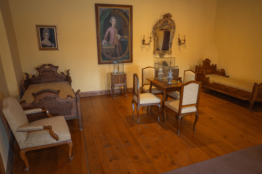 Rokoko soba predstavljena je u dva dijela, kao radni prostor smješten lijevo te spavaonica u desnom dijelu sobe. Cjelokupan inventar je iz druge polovine 18. stoljeća. U kabinetskom dijelu nalaze se dva rezbarena i fino ukrašena sekretera – pisaćih stolova s ladicama i tajnim pretincima. Na zidovima su, u ovalnim okvirima, izloženi obiteljskii portreti nastali u prvoj polovini 18. stoljeća.