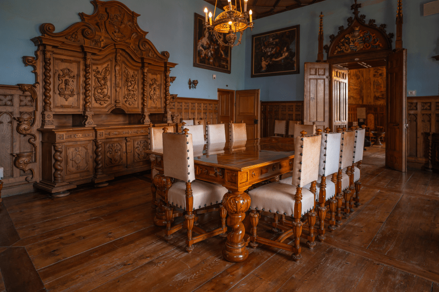 Blagovaonica je opremljena neostilskim namještajem izrađenim šezdesetih godina 19. stoljeća, po strogo definiranoj narudžbi vlasnika čiji se grbovi nalaze na namještaju. Namještaj čine: veliki ugrađeni ormar, kutne vitrine, stolice presvučene kožom, te stolić-umivaonik. Izložen je dio sačuvanog porculanskog posuđa iz 18. i 19. stoljeća. Hrana se dopremala iz pomoćne prostorije čija su vrata uklopljena u zidnu oplatu, a pripremala se u dvorskoj kuhinji smještenoj dvije etaže niže.