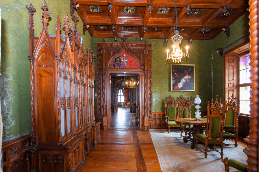 Mali salon za čitanje opremljen je pokućstvom, zidnom dekoracijom i otvorenim kaminom u neogotičkom stilu. Sačuvane originalne plišane tapete iz vremena prethodne obnove dvorca, koloristički su usklađene s ostalom draperijom te jasno dočaravaju salonski ugođaj druge polovine 19. stoljeća. Namještaj izrazitih neogotičkih oblika čine: veliki ormar koji je služio za smještaj knjiga, trosjed, stolice i naslonjači.
