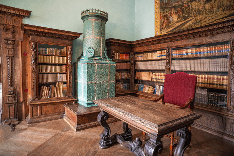 Radni prostor vlasnika dvorca namješten je mobilijarom i policama za knjige neorenesansnog stila. Cjelokupna dvorska knjižnica danas broji oko 1700 knjiga iz ostavštine obitelji Drašković. Uz beletristička i enciklopedistička izdanja te periodiku, unutar fonda nalaze se također i stručni priručnici o lovu, kulinarstvu, sportu, itd. Veći dio knjižnog fonda je iz 19. stoljeća, a tek manji dio pripada 18. i početku 20. stoljeća. Knjige su pisane većinom njemačkim i francuskim jezikom. Izložena je i mala arheološka zbirka: polirane sjekire iz neolitika i eneolitika te glinene posude iz brončanog doba.