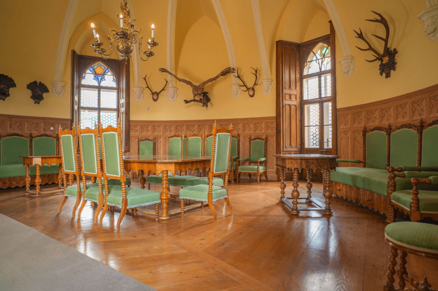 Namještaj je izrađen u orahovini i tapeciran zelenom tkaninom, neostilskih je karakteristika i potječe iz sedamdesetih godina 19. stoljeća. Bogato je uređena i ukrašena lovačkim trofejima s prijelaza iz 19. u 20. stoljeće. Dvoranu krasi velika bijela kaljeva peć ukrašena reljefom s lovačkim motivima.