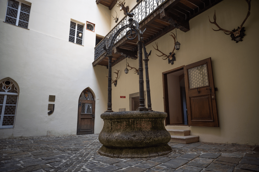 U središnjem dijelu zgrade nalazi se dvorište četverokutnog oblika s cisternom, čiji donji kameni dio pripada 17. stoljeću, dok je gornji od lijevanog željeza postavljen u 19. stoljeću. Dva kata sjevernog zida dvorišta u baroknom razdoblju, bila su otvorena dvostrukim polukružnim arkadama čiji su ostaci danas vidljivi u unutrašnjosti. Kroz istočni i južni zid u dvije razine protežu se balkoni, ložišta za peći i trofeji rogova jelena. U zidu dvorišta nalazi se sat s dvostrukim brojčanikom, rad varaždinskog urara J. Bechela iz 19. stoljeća.