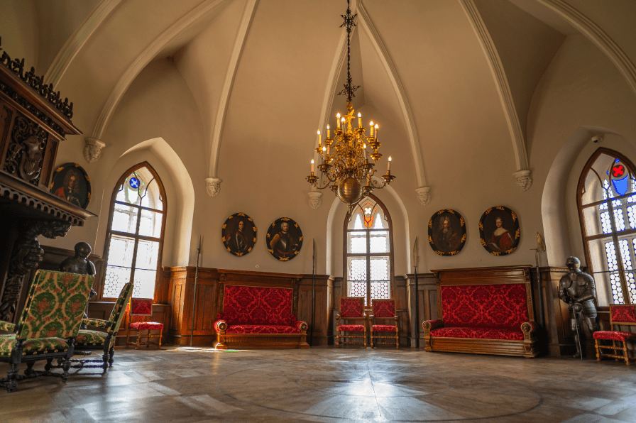 Viteška dvorana smještena je u zapadnoj kuli i najreprezentativniji je dio dvorca. Taj svečani prostor preuređen u 19. stoljeću nastoji nas vratiti u srednjovjekovnu romantičarsku prošlost i evocirati viteške vrline. Danas simbolizira vojničku prošlost Trakošćana i obitelji Drašković. Dvorana je opremljena neorenesansnim namještajem i otvorenim kaminom s bogato dekoriranom drvenom maskom na kojoj se nalaze grbovi obitelji Drašković i Latour. U središtu prostorije nalaze se dvije replike viteških oklopa za cijelo tijelo koji potječu iz devetnaestog stoljeća. Zidovi viteške su ukrašeni oružjem na motki s kraja 16. i iz 17. stoljeća, portretima članova carske i kraljevske obitelji Habsburg te carskih generala u ovalnim drvenim okvirima ukrašenim pozlaćenim listovima akantusa. Središtem dvorane dominiraju dva viteška konjanička oklopa.